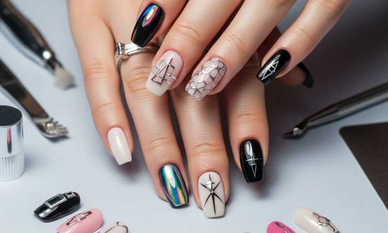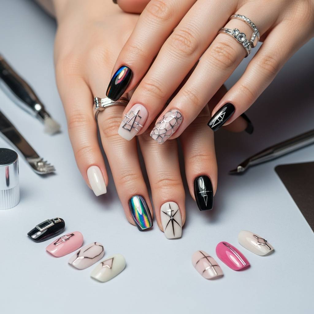 3つ目は「ジオメトリックカットアウト」。幾何学模様とネガティブスペース(素爪が見える部分)を組み合わせた斬新なデザイン。モダンでありながらも繊細な印象を与えます。