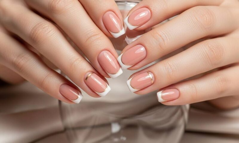 今、大人の女性の間で支持されているのは、ベースカラーにこだわった「美爪フレンチ」です。これは、自爪のピンク色の部分(ネイルベッド)に近い、あるいは肌のトーンに合わせたスキンカラーをベースに塗布してから、先端にフレンチラインを描くスタイルです。自身の肌色に溶け込むピンクベージュやグレージュをベースに仕込むことで、爪の血色感がアップし、手肌全体が明るく健康的に見えます。